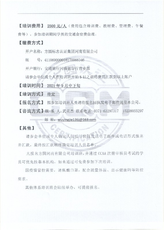 關(guān)于舉辦管理體系國家注冊審核員培訓班的通知
